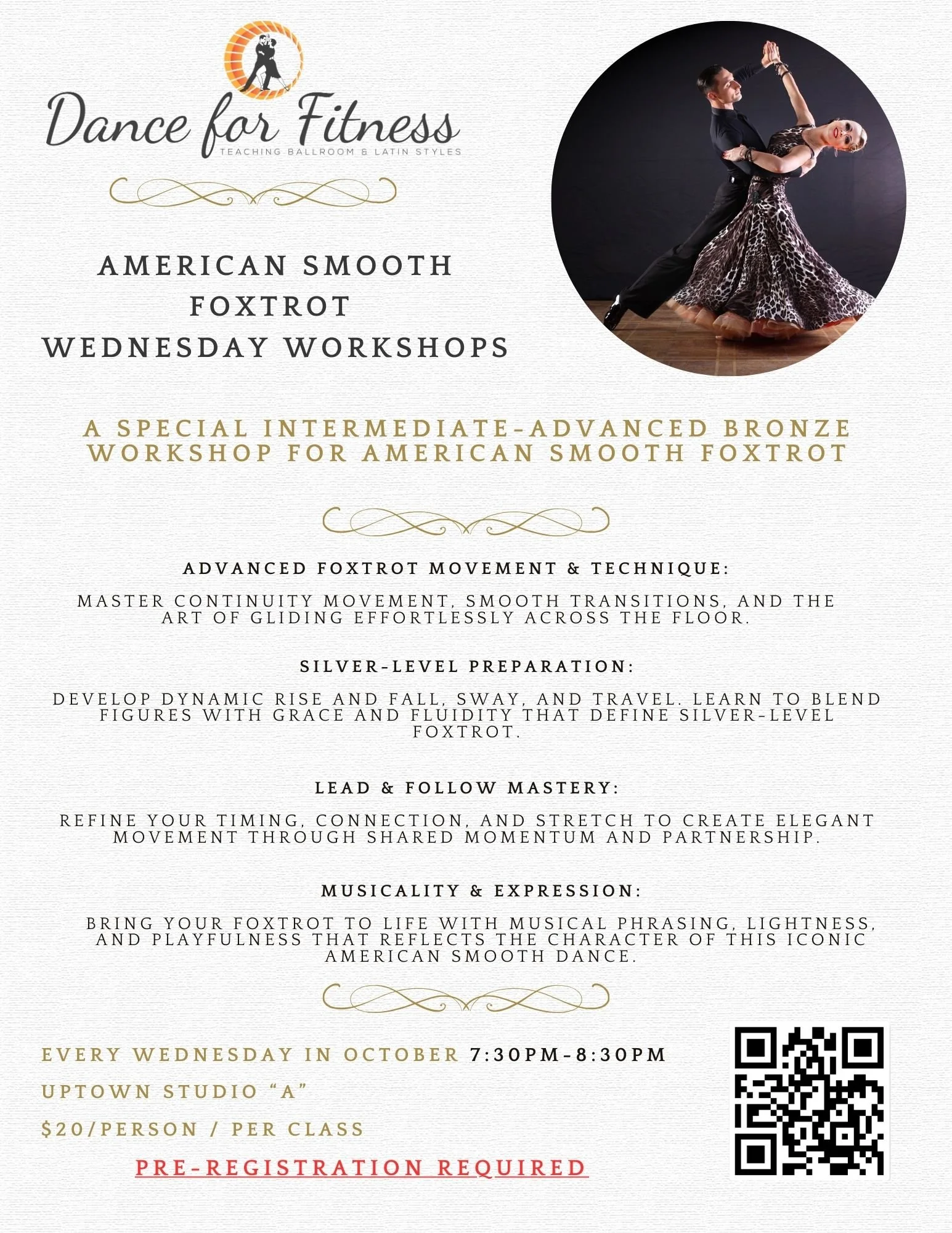 Dive deep into the elegance of American Smooth Foxtrot with our weekly workshops. Designed for Intermediate to Advanced Bronze dancers, this class prepares you for Silver level technique while refining your artistry and expression.
